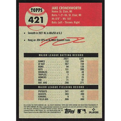 This is a 2022 Topps Chrome Platinum Anniversary Jake Cronenworth baseball card. The card is #421 and pictures show condition.