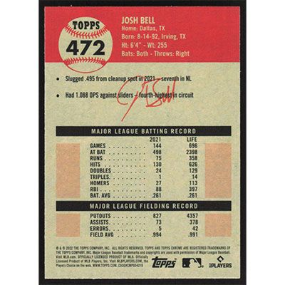 This is a 2022 Topps Chrome Platinum Anniversary Josh Bell baseball card. The card is #472 and pictures show condition.
