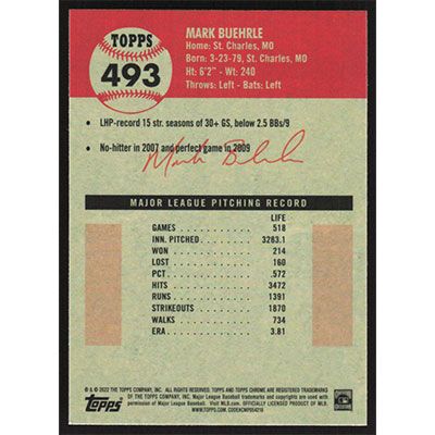 This is a 2022 Topps Chrome Platinum Anniversary Mark Buehrle baseball card. The card is #493 and pictures show condition.