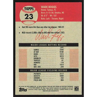 This is a 2022 Topps Chrome Platinum Anniversary Prism Refractors Wade Boggs baseball card. The card is #23 and pictures show condition. Team(s): Boston Red Sox