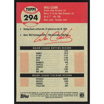 This is a 2022 Topps Chrome Platinum Anniversary Prism Refractors Will Clark baseball card. The card is #294 and pictures show condition. Team(s): San Francisco Giants