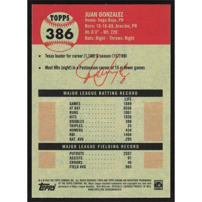 This is a 2022 Topps Chrome Platinum Anniversary Prism Refractors Juan Gonzalez baseball card. The card is #386 and pictures show condition. Team(s): Texas Rangers