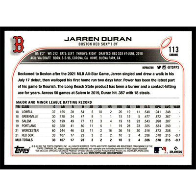 This is a 2022 Topps Chrome Refractors Jarren Duran baseball card. The card is #113 and pictures show condition. Team(s): Boston Red Sox Rookie Card (RC)