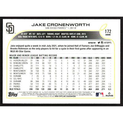 This is a 2022 Topps Chrome Refractors Jake Cronenworth baseball card. The card is #172 and pictures show condition.