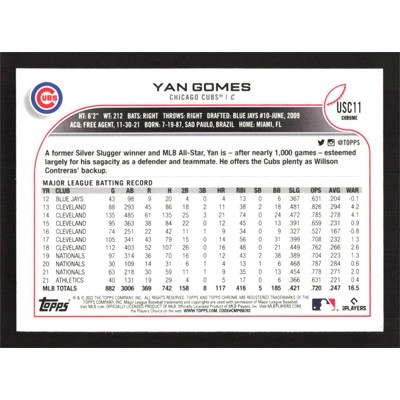 This is a 2022 Topps Chrome Update Purple Refractors Yan Gomes baseball card. The card is #USC11 and pictures show condition.