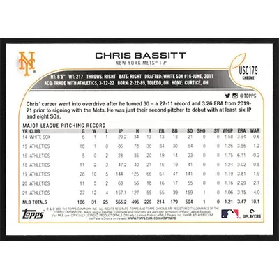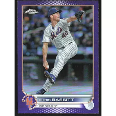 This is a 2022 Topps Chrome Update Purple Refractors Chris Bassitt baseball card. The card is #USC179 and pictures show condition.