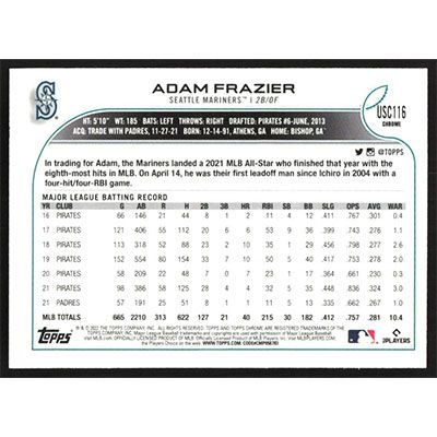 This is a 2022 Topps Chrome Update Adam Frazier baseball card. The card is #USC116 and pictures show condition.