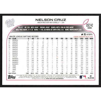 This is a 2022 Topps Chrome Update Nelson Cruz baseball card. The card is #USC142 and pictures show condition.