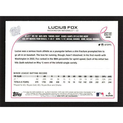 This is a 2022 Topps Chrome Update Lucius Fox baseball card. The card is #USC181 and pictures show condition. Team(s): Washington Nationals Rookie Card (RC)