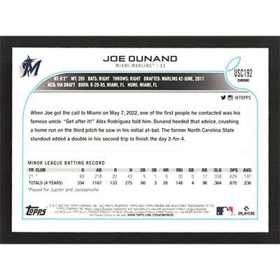 This is a 2022 Topps Chrome Update Joe Dunand baseball card. The card is #USC192 and pictures show condition. Team(s): Miami Marlins Rookie Card (RC)