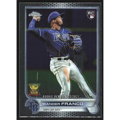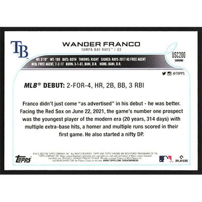 This is a 2022 Topps Chrome Update Wander Franco Rookie Debut baseball card. The card is #USC200 and pictures show condition. Team(s): Tampa Bay Rays Rookie Card (RC)