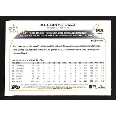 This is a 2022 Topps Chrome Update Aledmys Diaz baseball card. The card is #USC36 and pictures show condition.