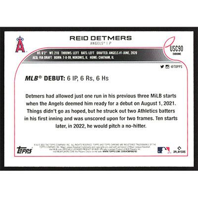 This is a 2022 Topps Chrome Update Reid Detmers Rookie Debut baseball card. The card is #USC90 and pictures show condition. Team(s): Los Angeles Angels Rookie Card (RC)