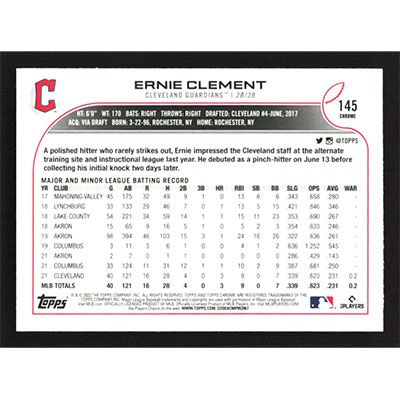 This is a 2022 Topps Chrome X-Fractors Ernie Clement baseball card. The card is #145 and pictures show condition. Team(s): Cleveland Guardians Rookie Card (RC)