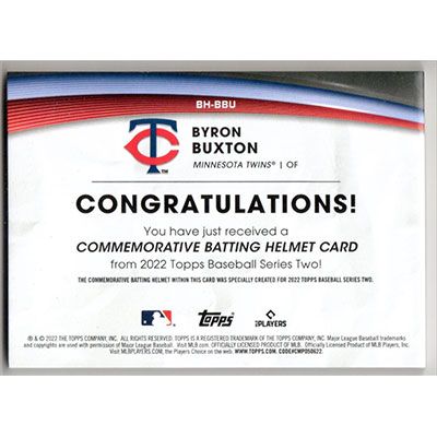 This is a 2022 Topps Commemorative Batting Helmet Relics Byron Buxton baseball card. The card is #BH-BBU and pictures show condition. Team(s): Minnesota Twins