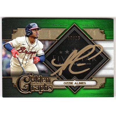 This is a 2022 Topps Five Star Golden Graphs Green Ozzie Albies autographed baseball card. This card has been signed, in gold paint pen, by Ozzie Albies, and is certified authentic by Topps. The card is #GG-OA and pictures show condition. This card is limited; #'d 03/15.
