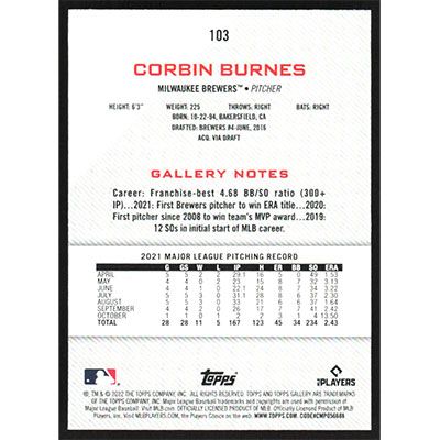 This is a 2022 Topps Gallery Corbin Burnes baseball card. The card is #103 and pictures show condition.