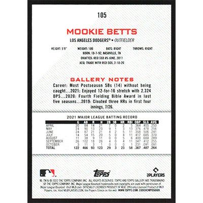 This is a 2022 Topps Gallery Mookie Betts baseball card. The card is #105 and pictures show condition.