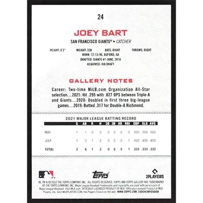 This is a 2022 Topps Gallery Joey Bart baseball card. The card is #24 and pictures show condition.
