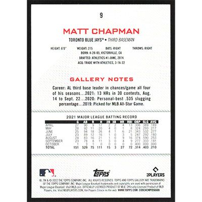 This is a 2022 Topps Gallery Matt Chapman baseball card. The card is #9 and pictures show condition.
