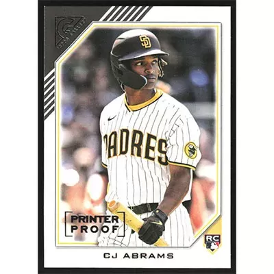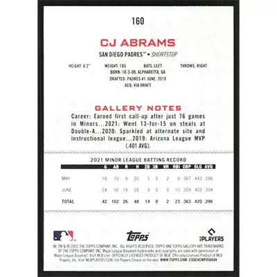 This is a 2022 Topps Gallery Printer Proof CJ Abrams baseball card. The card is #160 and pictures show condition. Team(s): San Diego Padres Rookie Card (RC)