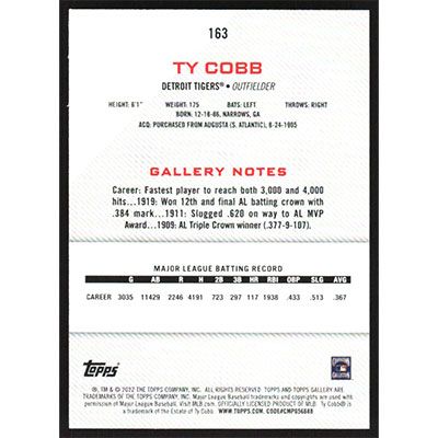 This is a 2022 Topps Gallery Printer Proofs Ty Cobb baseball card. The card is #163 and pictures show condition.