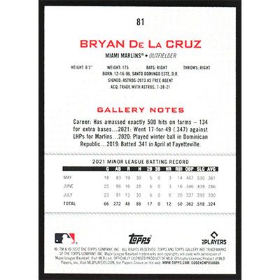 This is a 2022 Topps Gallery Rainbow Foil Bryan De La Cruz baseball card. The card is #81 and pictures show condition. Team(s): Miami Marlins Rookie Card (RC)