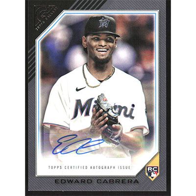 This is a 2022 Topps Gallery Rookie Autographs Edward Cabrera autographed baseball card. This card has been signed, in blue, by Edward Cabrera, and is certified authentic by Topps. The card is #RA-ECA and pictures show condition.