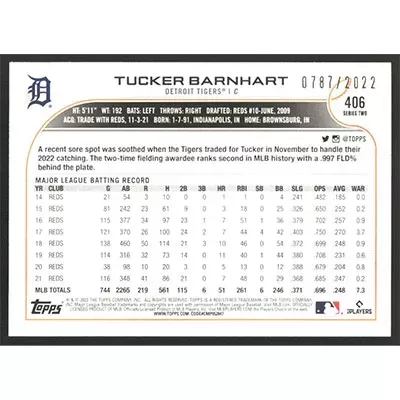 This is a 2022 Topps Gold Tucker Barnhart baseball card. The card is #406 and pictures show condition. This card is limited; #'d 0787/2022. Team(s): Detroit Tigers