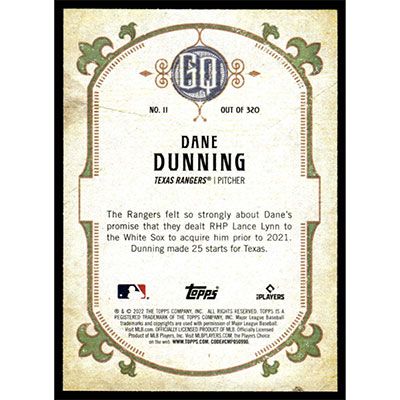 This is a 2022 Topps Gypsy Queen Dane Dunning baseball card. The card is #11 and pictures show condition.