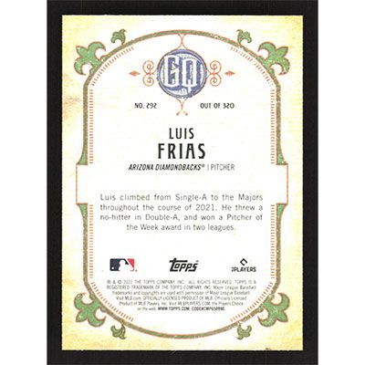 This is a 2022 Topps Gypsy Queen Luis Frias baseball card. The card is #292 and pictures show condition. Team(s): Arizona Diamondbacks Rookie Card (RC)
