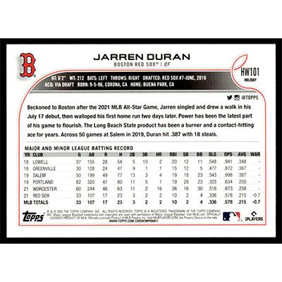 This is a 2022 Topps Holiday Jarren Duran baseball card. The card is #HW101 and pictures show condition.