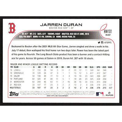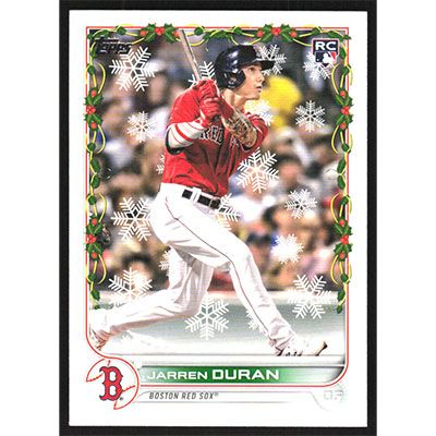 This is a 2022 Topps Holiday Photo Variation Jarren Duran Candy Cane Sleeve baseball card. The card is #HW101 and pictures show condition.