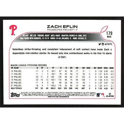 This is a 2022 Topps Mini Zach Eflin baseball card. The card is #179 and pictures show condition.