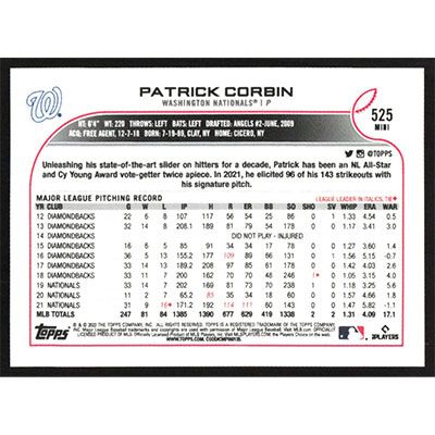 This is a 2022 Topps Mini Patrick Corbin baseball card. The card is #525 and pictures show condition.
