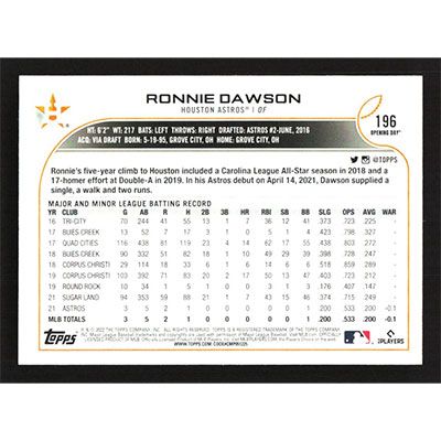 This is a 2022 Topps Opening Day Ronnie Dawson baseball card. The card is #196 and pictures show condition.