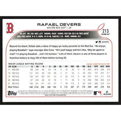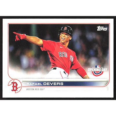This is a 2022 Topps Opening Day Rafael Devers baseball card. The card is #213 and pictures show condition.