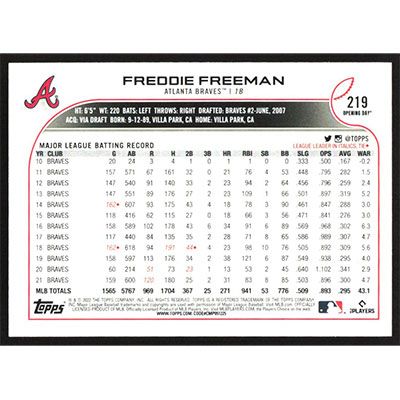 This is a 2022 Topps Opening Day Freddie Freeman baseball card. The card is #219 and pictures show condition.