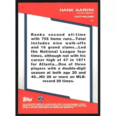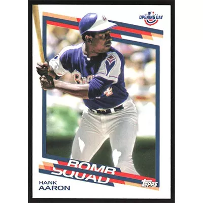 This is a 2022 Topps Opening Day Bomb Squad Hank Aaron baseball card. The card is #BS-1 and pictures show condition.