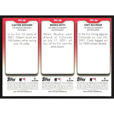 This is a 2022 Topps Opening Day Triple Play Cody Bellinger, Mookie Betts and Clayton Kershaw baseball card. The card is #TPC-3A-C and pictures show condition.