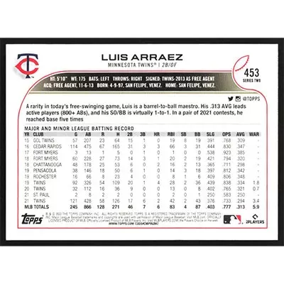 This is a 2022 Topps Rainbow Foil Luis Arraez baseball card. The card is #453 and pictures show condition.