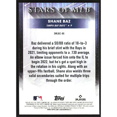 This is a 2022 Topps Stars of MLB Chrome Shane Baz baseball card. The card is #SMLBC-86 and pictures show condition. Team(s): Tampa Bay Rays Rookie Card (RC)