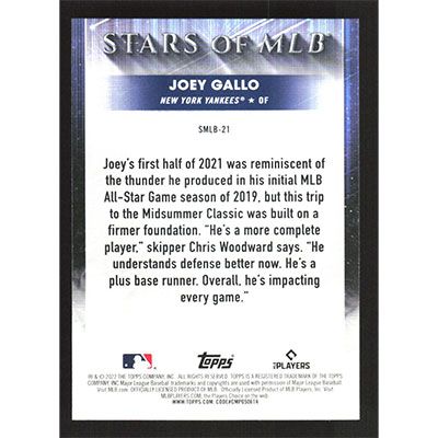 This is a 2022 Topps Stars of MLB Joey Gallo baseball card. The card is #SMLB-21 and pictures show condition.