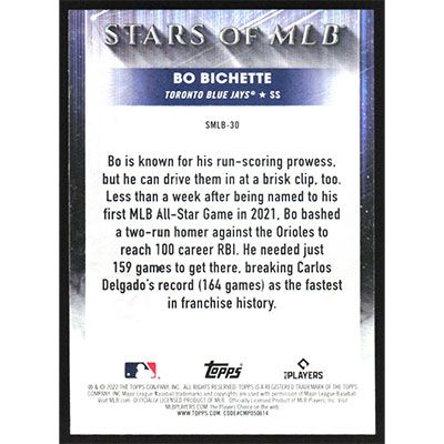 This is a 2022 Topps Stars of MLB Bo Bichette baseball card. The card is #SMLB-30 and pictures show condition.
