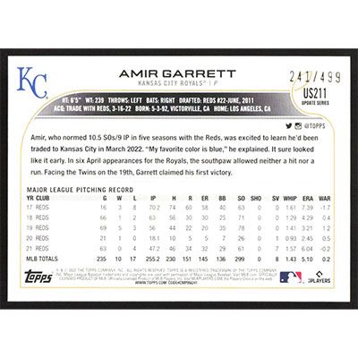This is a 2022 Topps Update Green Foil Amir Garrett baseball card. The card is #US211 and pictures show condition. This card is limited; #'d 241/499. Team(s): Kansas City Royals