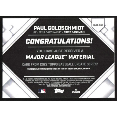 This is a 2022 Topps Update Major League Materials Paul Goldschmidt Jersey baseball card. The card is #MLM-PGO and pictures show condition. Team(s): St. Louis Cardinals