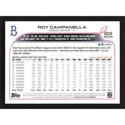 This is a 2022 Topps Update Photo Variations Roy Campanella baseball card. The card is #US245 and pictures show condition.