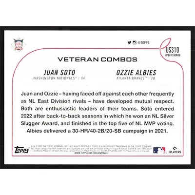 This is a 2022 Topps Update Rainbow Foil Ozzie Albies and Juan Soto Veteran Combos Rivalry Love baseball card. The card is #US310 and pictures show condition.