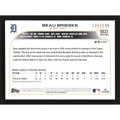 This is a 2022 Topps Update Red Foil Beau Brieske baseball card. The card is #US23 and pictures show condition. This card is limited; #'d 105/199. Team(s): Detroit Tigers Rookie Card (RC)
