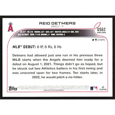 This is a 2022 Topps Update Royal Blue Reid Detmers Rookie Debut baseball card. The card is #US62 and pictures show condition. Team(s): Los Angeles Angels Rookie Card (RC)